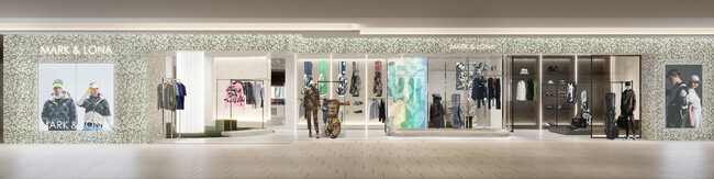ガラス張りのファサードにはブランドアイコンのオリジナルカモフラージュがグラフィックのレイヤードガラスで表現され、 エントランスの両サイドに設置された大型のデジタルサイネージからは、MARK & LONAの最新情報やコレクションムービーが世界に向けて発信されます。 また、正面左側のスペースにはゴルフ場の光を表現したモールディングライトが施されたアイコニックタワーを配置しています。随所にあしらわれたテラゾータイルと洗練されたカラーパレットで統一された店内で、心行くまでお買い物をお楽しみいただけます。