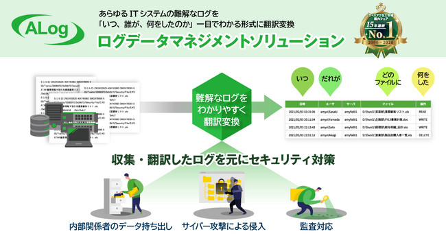 国内外5,100契約以上の導入実績を誇る、ログデータマネジメントソリューション「ALogシリーズ」は、サーバアクセス監視パッケージ別シェアで、15年連続トップシェアを獲得(※1)しております。オンプレ/クラウド問わず、多様な情報システムのログをエージェントレスで自動集約・運用監視するデータセキュリティソリューションです。独自のログ翻訳変換技術とAIの不正予兆検知により、専門知識やノウハウがなくとも、高度なログ活用を実現。内部不正対策やサイバー攻撃対策、障害原因の追究、ワークスタイル変革など、あらゆるビジネスの課題を解決します。