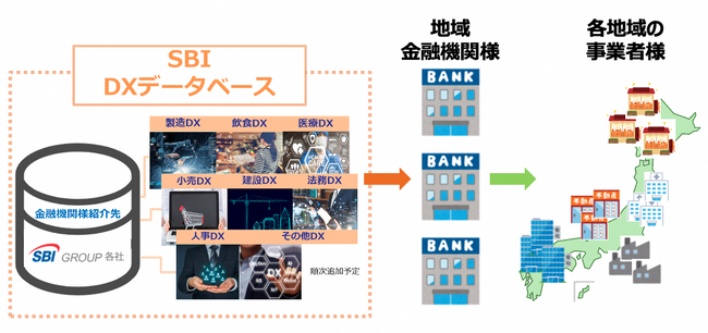 「SBI DXデータベース」は、SBIグループがベンチャー企業投資などを通じて培ったネットワークを駆使し、中小企業のDX化に資するソリューションの幅広なラインナップをデータベース化したサービスです。地域金融機関は本サービスを活用することで、効率的な取引先支援メニューの構築が可能になります。