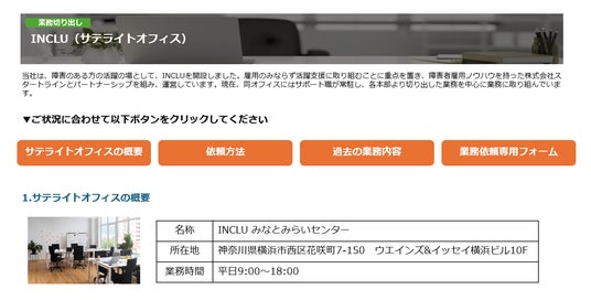 INCLUは、職域開拓や採用、適性判断やチームビルディング、定着や能力開発に関する相談までトータルで支援します。ハード面の環境だけでなく、障害者雇用支援の専門的な知識を有した当社社員が常駐しているため、様々な障害種別の方が安心してバリアフリーな就業をすることができます。