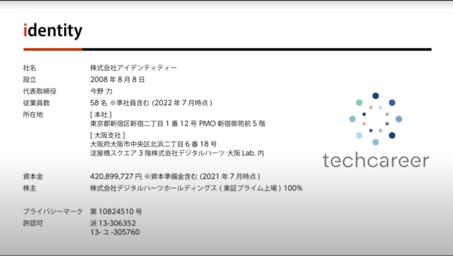 ITフリーランスエンジニアの案件・求人サイト「テクフリ」(https://freelance.techcareer.jp/)を運営する株式会社アイデンティティー(東京都新宿区、以下「当社」)は、「【会社説明】2分でわかるアイデンティティー」を公開しました。