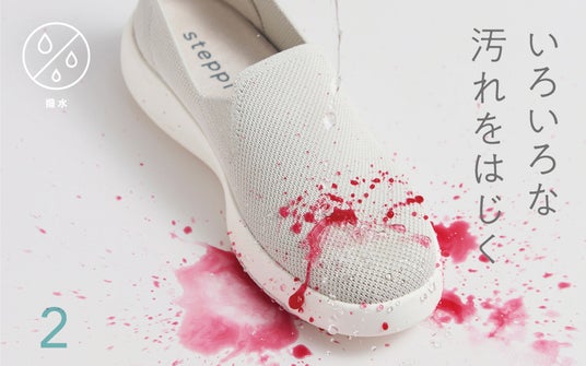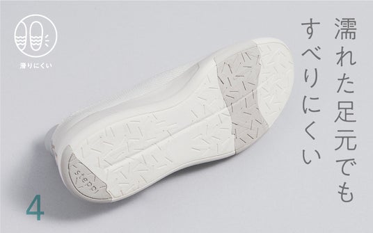 『steppi』の元々の特性である「軽量」「疲れにくい」「撥水(汚れをはじく)」「通気性」「洗濯機で洗える」に加えて、濡れた路面でも滑りにくいソールと、抗菌防臭機能が備わったインソールが搭載されています。