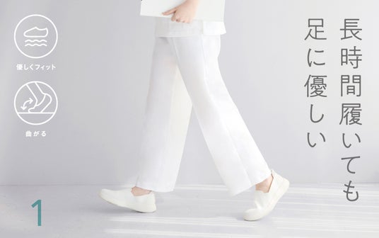 医療現場で働く人々の声を形にした結果、誰しもが使いやすくシンプルで履き心地の良いデザインの靴が生まれた。アッパー部分は伸縮性があることで心地よさを伴い、手を使わずして簡単に着脱できる点はさまざまな用途・シーンへの汎用が期待できる。
