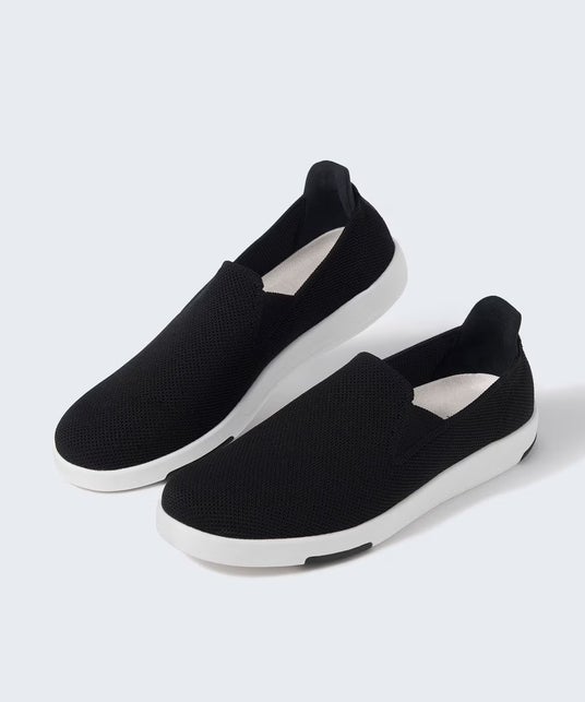 スリッポンタイプのニットシューズ。独自に開発したヒールサポートにより、手を使わずさっと脱ぎ履きができます。