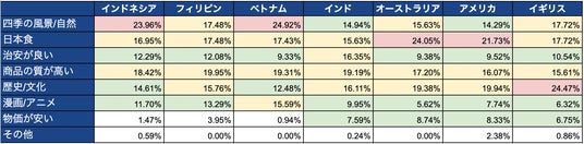 全体的に「四季の風景」「日本食」の数値が高く、アメリカ・イギリス・オーストラリアでは「歴史/文化」の評価も高いことが分かりました。昨今では、買い物よりも体験を重視する傾向が強まっており、日本の古き良き文化を感じられる体験型へのコト消費へ繋げられるようなアプローチが重要となっています。