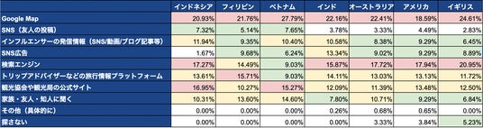 全ての国・地域において、「Google Map」の回答率が最も高く、次いで「検索エンジン」が多くの国で選択される結果となりました。近年では若い世代を中心に、検索エンジンよりもSNS上で検索して情報収集をする人が増えているものの、「Google Map」は旅行系アプリの中でもっともダウンロードされており*2、世界中のユーザーが慣れ親しんだ観光には欠かせないアプリとなっています。