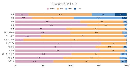 一方で、「嫌い」「大嫌い」の合計値が最も高いのは中国(合計47.2%)、「大嫌い」の回答率が最も高いのは韓国(10.1%)となりました。 中国は前回2023年の調査から「嫌い」「大嫌い」の合計値が約2倍に増加しており、東京電力福島第一原子力発電所の処理水放出の影響により、日本への好感度が低下したと考えられます。