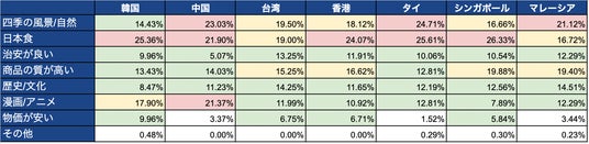 韓国を除き、13カ国・地域で「東京」が最も多い結果となりました。背景には、日本国内における新型コロナウイルス関連規制の緩和に加え、東京は日本の文化や食べ物、買い物が楽しめるだけでなく、衛生的で交通の便や治安が良いこと、さらに新宿御苑など都会の中心にありながら伝統的な日本庭園で四季折々の自然を楽しめることなどが考えられます。また、オタクの聖地として海外からも絶大な支持を受けている秋葉原や、日本の「カワイイ」を満喫できる原宿など、日本が世界に誇る様々なカルチャーを体験できるため、外国人観光客にとって一層魅力的な旅行先となっていることも考えられます。