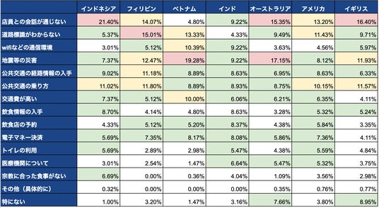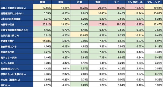 全体的に「店員との会話が通じない」「地震等の災害」の回答率が高い結果となりました。特に、「地震等の災害」を選択する割合は、昨年の調査結果と比べて若干ながらも増加している国が多く、令和6年能登半島地震の発生が海外でも報じられたことが要因の一つとも考えられます。