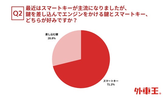 輸入車オーナーの方に「鍵を差し込んでエンジンをかける鍵とスマートキー、どちらが好みか」を尋ねたところ、「スマートキー」が71.2%を占めました。