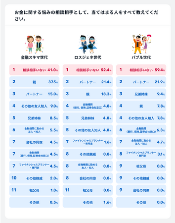 ・お金に関する相談相手がいる1位は「金融スキマ世代」で、親への相談が主流(37.5%)。「ロスジェネ世代」と「バブル世代」は約半数が相談相手はいないと回答しており、世代間での相談傾向に差が見られる