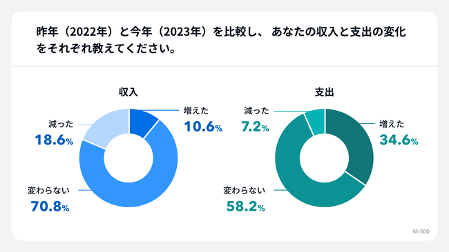 「昨年(2022年)と今年(2023年)を比較し、 あなたの収入と支出の変化をそれぞれ教えてください。」という質問に対して、収入が「増えた」と回答した人は僅か10.6%、「変わらない」70.8%、「減った」18.6%という結果になりました。一方、支出に関しては「増えた」34.6%、「変わらない」58.2%、「減った」7.2%という結果になりました。昨年と比較すると、収入よりも支出が増えている傾向が分かりました。