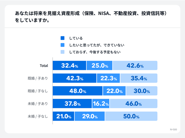 「あなたは将来を見据え資産形成(保険、NISA、不動産投資、投資信託等)をしていますか。」という質問に対して、「している」32.4%、「したいと思っているが、できていない」25.0%、「しておらず、今後もする予定ない」42.6%という結果になりました。