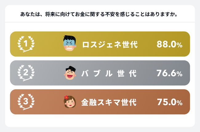 「あなたは、将来に向けてお金に関する不安を感じることはありますか。」という質問に対して、「不安を感じる」ランキング1位は「ロスジェネ世代」88.0%でした。2位は「バブル世代」76.6%、3位は「金融スキマ世代」75.0%という結果となっており、1位の「ロスジェネ世代」と3位の「金融スキマ世代」は13ptの差が出る結果となりました。