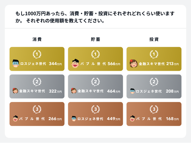 ・「もし1000万円あったら?」消費額1位「ロスジェネ世代」(344万円)、貯蓄額1位「バブル世代」(566万円)、投資額1位「金融スキマ世代」(213万円)。バブル世代は貯蓄に重きを置く傾向が強く、若い世代ほど投資に関心が高いことが明らかに