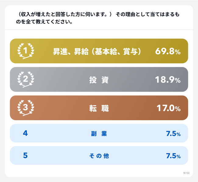 さらに、収入が増えたと回答した方へ、「その理由として当てはまるものを全て教えてください。」と質問したところ、「昇進、昇給(基本給、賞与)」と答えた方が最も多く69.8%、次いで「投資」18.9%、「転職」17.0%、「副業」7.5%という結果になりました。