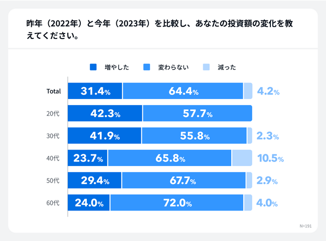 また、投資をしている人へ、「昨年(2022年)と今年(2023年)を比較し、あなたの投資額の変化を教えてください。」と質問をしたところ、「増やした」31.4%、「変わらない」64.4%、「減った」4.2%という結果になりました。