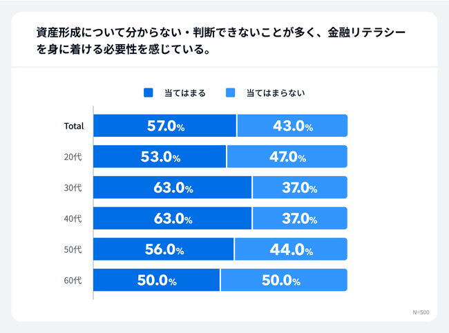 ・金融リテラシーの必要性を感じている人は57.0%、30~40代が最も高く63.0%