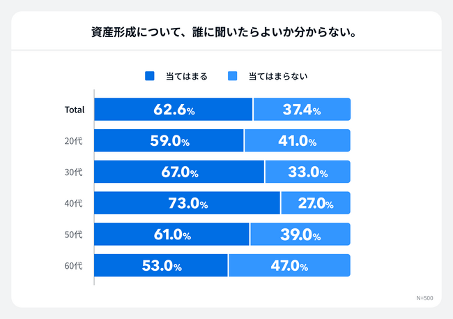 ・資産形成に関して相談すべき相手が分からない人は62.6%、40代が最も多く73.0%、次いで30代が67.0%