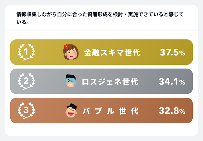 「情報収集しながら自分に合った資産形成を検討・実施できていると感じている。」に「当てはまる」と回答したランキング1位は「金融スキマ世代」37.5%でした。2位は「ロスジェネ世代」34.1%、3位は「バブル世代」32.8%という結果になっており、それぞれ大差はないものの、若い世代の方が資産形成の満足度が高いということが分かりました。