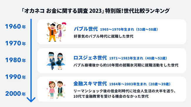 【「オカネコ お金に関する調査 2023」特別版!金融スキマ世代・ロスジェネ世代・バブル世代比較ランキング結果サマリー】