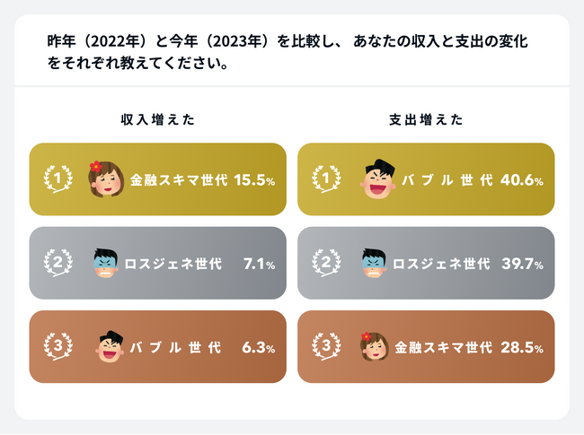 「昨年(2022年)と今年(2023年)を比較し、 あなたの収入と支出の変化をそれぞれ教えてください。」という質問に対して、「収入が増えた」ランキング1位は「金融スキマ世代」15.5%でした。