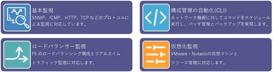 モジュール化設計を採用しており、企業の規模や発展段階に合わせて柔軟に拡張可能です。基本的な稼働監視からスタートし、必要に応じて「CLI自動化」や「仮想化監視」などのコアモジュールを段階的に追加できるため、既存の監視環境を再構築することなく、長期的なIT投資の最適化を実現します。