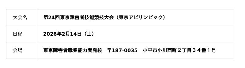 本大会は、障がいのある方々が日頃磨いてきた技能を競い合い、職業能力の向上を図るとともに、企業や社会の理解を深めて障がい者雇用を促進することを目的とし開催されています。
