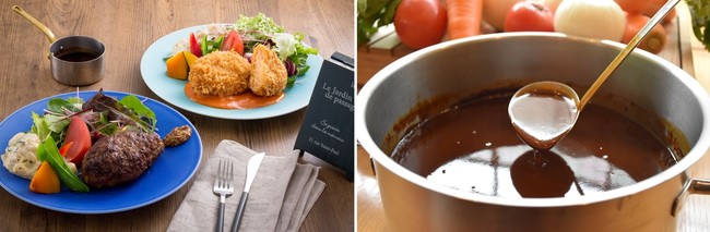 洋食メニュー一番のこだわりは特製のデミグラスソース。牛すじやトマト、香味野菜を入れて約6時間じっくり煮込み、牛の濃厚なうま味と野菜の甘味、トマトの酸味が絶妙なバランスのソースに仕上げています。カニクリームコロッケは、カニ身がたっぷり詰まった甲殻類のベシャメルソースを使用し、兵庫県産規格外のトマトで作るトマトソースでお召しあがりいただけます。