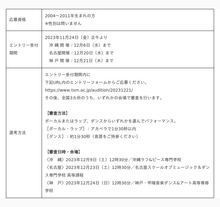 滋慶学園COMグループの総合専門学校「学校法人滋慶学園 東京スクールオブミュージック&ダンス専門学校(TSM)」の姉妹校と学校法人ラフ&ピース 沖縄ラフ&ピース専門学校で、韓国のエンターテインメントライフスタイルプラットフォーム企業である「HYBE」傘下のレーベル「ADOR」のオーディションを開催いたします。