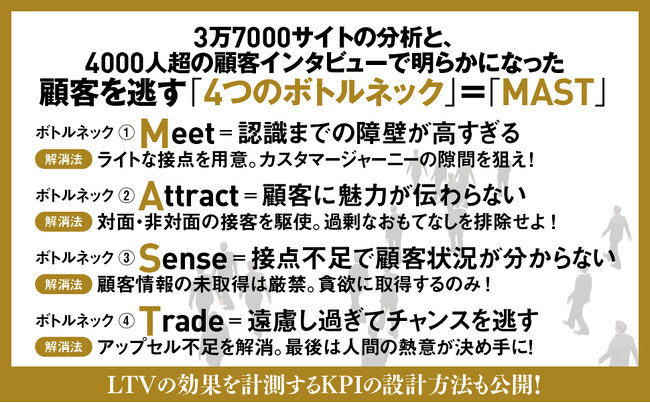 やがて「顧客視点」に目覚めた企業はLTV強化に乗り出しますが、様々な施策を繰り出すも効果が上がらず、LTVを損ねる「ボトルネック」と向き合うことになります。本書はカスタマージャーニー上において、顧客が逃げ出してしまう「4つのボトルネック=MAST」を浮き彫りにし、企業と顧客が向き合う接点ごとに有効な対処法を紹介。マーケティングや営業、顧客サービス部門の担当者がすぐに実践できるよう、多彩な事例を示しながら分かりやすく解説します。