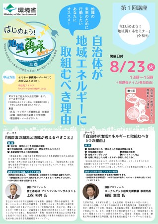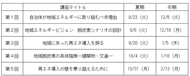 この度は、これから地域再エネ事業を進めたいと考えている地域の自治体職員を主な対象として、地域再エネ事業の基礎を学ぶことができるオンライン連続講座を環境省の主催により全5回の予定で開催します。本講座は同内容で本年度中に夏期・冬期の2回開講し、今回は夏期講座の案内となります。各回とも13:00開始、所要2時間~2時間半を予定しています。