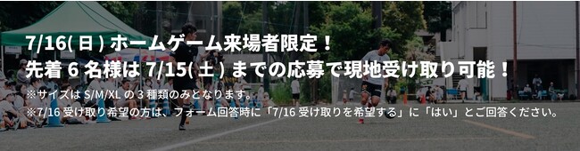 ※7/16のホームゲーム(SHIBUYA CITY FC vs Intel Biloba Tokyo@渋谷区スポーツセンター)で受け取り希望の方は、フォーム回答時に「7/16受け取りを希望する」に「はい」とご回答ください。ただし、サイズと在庫状況によっては当日のお渡しができない場合もございますのでご了承ください。