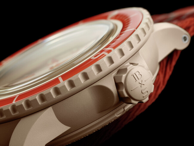 Swatchグループの2つのブランドによる今回のコラボレーションでは、全モデルがBioceramic製です。このユニークな素材はSwatchにより特許取得済みで、3分の2がセラミック、3分の1がヒマシ油を原料にしたバイオ由来素材から作られています。大洋の環境保全への取り組みの表現として、NATOストラップは使用済みの漁網からリサイクルして作られています。