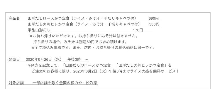 このたび松屋フーズ(本社:東京都武蔵野市、代表取締役社長:瓦葺一利)では、とんかつ専門店の「松のや・松乃家」におきまして、2020年8月26日(水)午後3時より「山形だしロースかつ定食」を新発売いたします。