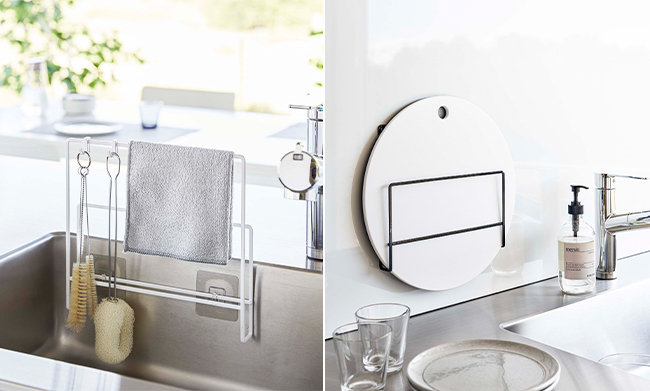 スリムに布巾やボトルブラシなどの長物も収納できるホルダー。