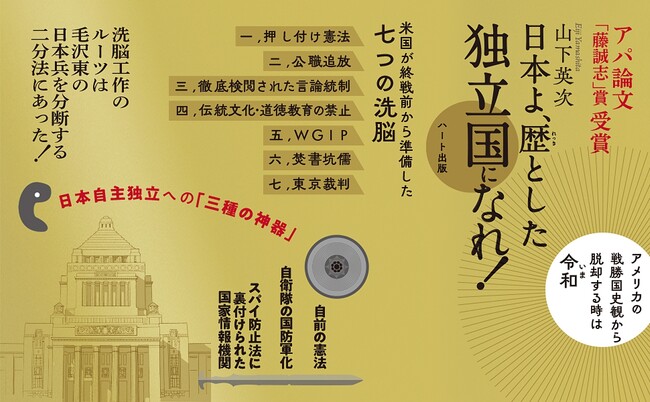 株式会社ハート出版(本社:東京都豊島区池袋 代表取締役:日高裕明)は、戦勝国史観(東京裁判史観、GHQ史観)の「洗脳」から日本国民は未だ目覚めていないとし、その洗脳を解くための“読む解毒剤”『日本よ、歴とした独立国になれ!』を刊行。その作品が公益財団法人アパ日本再興財団主催の第六回アパ日本再興大賞候補作品の一つに選定されました。