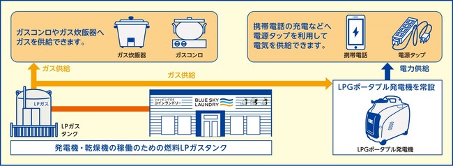 災害対応型ランドリーは「標準仕様」として3日分のLPガスを貯槽できるLPガスボンベ、ポータブル発電機への接続が可能な設備を完備します。ポータブル発電機はガスを利用して発電する仕組みになっており、携帯電話充電などへ電力供給することができます。また、店舗にガスコンロ、ガス炊飯器を導入し、被災者向けの炊き出しが可能になります。昨今の社会情勢により三密回避に向けた分散避難が必要となる中、コインランドリーを“臨時避難所“として活用する事ができます。なお、今回のオープン店舗を含む170店舗中55店舗が災害対応型コインランドリーとして機能しています。