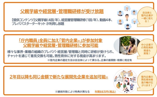 当社が提供する「男性育休定額制サービス」は、契約期間中に当社代表の小室淑恵による管理職向け研修、育児休業を取得した当社コンサルタントによる合同父親学級などを、人数・回数無制限で受けられる定額制サービスです。自治体版では、自治体職員向けのサービス提供に加え、多くの自治体からリクエストを受けて「男性育休の取組が進まない管内中小企業」を対象に同サービスを提供します。