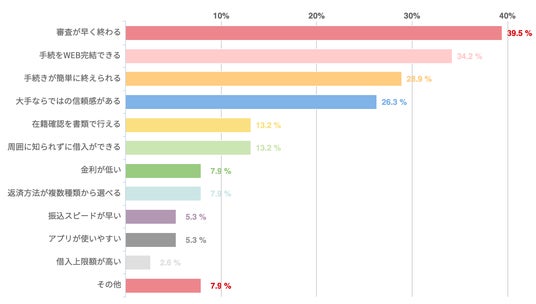 アンケートによれば、他社と比較したSMBCモビットのメリットには、「審査が早く終わる(39.5%)」点と「手続きがWEBで完結する(34.2%)」点が挙げられた。