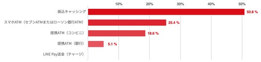 なお、「コンビニATM(18.6%)」や「銀行ATM(5.1%)」を利用するユーザーもいたが、「LINE Payからの送金」を利用している回答者はいなかった。