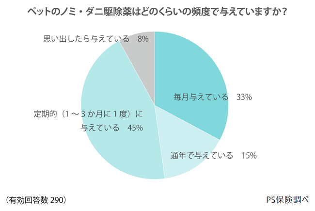 「毎月与えている」(33%)、「通年で与えている」(15%)という回答と合わせると9割以上に上る結果となり、ノミ・ダニ駆除薬を与えているほとんどの飼い主が習慣的に行っていることが明らかに。