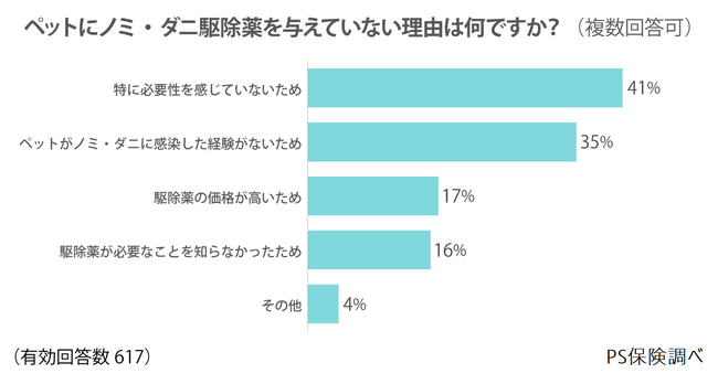 ペットにノミ・ダニ駆除薬を与えていない飼い主に対し、その理由を聞いたところ、「特に必要性を感じていないため」が、最多の41%という結果になりました。