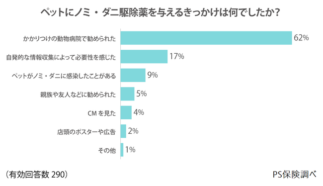 ノミ・ダニ駆除薬を与えている飼い主が、駆除薬を与えるきっかけとして挙げたのは、「かかりつけの動物病院で勧められた」が最多で62%となりました。