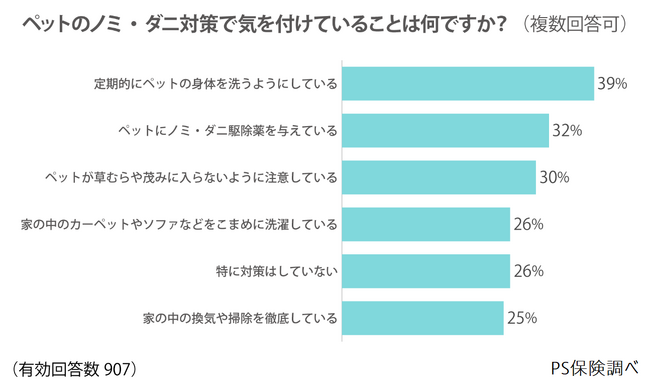 飼い主がペットのノミ・ダニ対策で気を付けていることには、「定期的にペットの身体を洗うようにしている」という回答が最も多く、全体の39%を占めました。次いで「ペットにノミ・ダニ駆除薬を与えている」との答えが多く、32%になっています。
