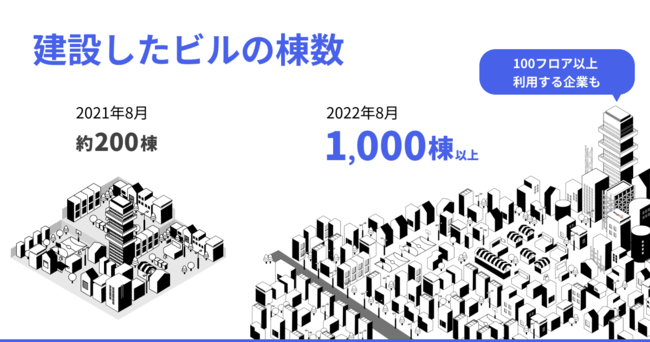 発行したスペース数は累計3万室。建設されたバーチャルビルの数も1000棟以上となっており、バーチャル空間のご利用が広がっています。なかには100フロア以上を利用し、従業員の方々が日々勤務している企業もあります。