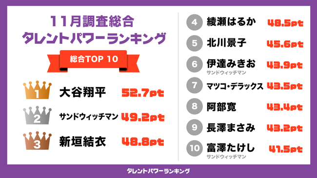 株式会社アーキテクトが実施しているタレントパワー定期調査から、タレントパワーランキングに登録されている全タレントのパワースコアを算出。