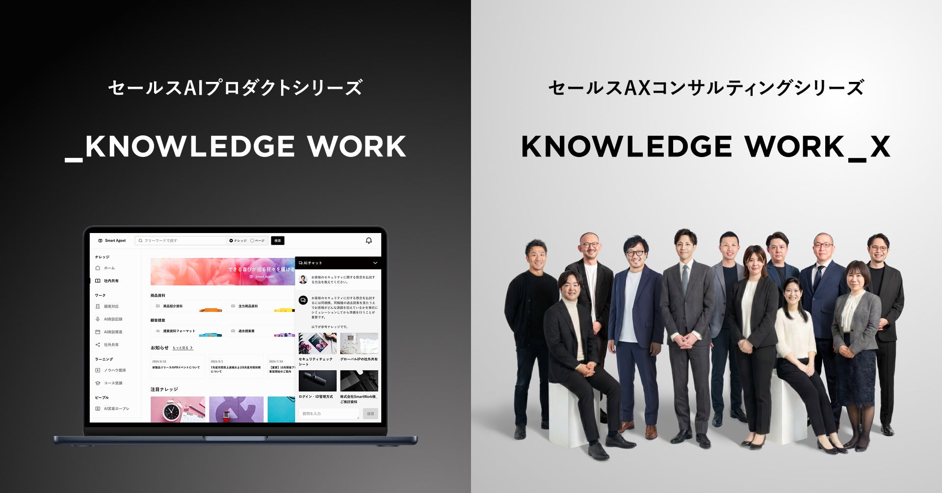 ナレッジワークのセールスAXソリューションでは、セールスAIプロダクトシリーズ「ナレッジワーク」とセールスAXコンサルティングシリーズ「ナレッジワーク X」を両輪で提供してまいります。