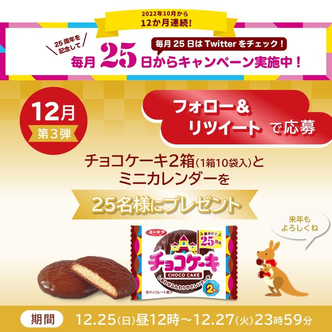 ユーラク「チョコケーキ」発売25周年を機に、より多くのみなさまにチョコケーキのおいしさを知っていただけるよう、2022年10月より12か月連続でチョコケーキが当たるキャンペーンを実施中です。25周年に掛けて毎月25日に開催する当キャンペーンの第3弾を、2022年12月25日(日)昼12時より開催いたします。