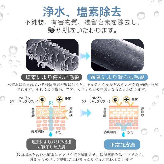 残留塩素を含む水道水はタンパク質を酸化させ、保湿機能を低下させたり、外部からのバリア機能がよわまったりすると言われています。